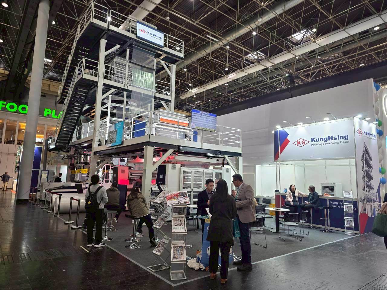 其中,光興機械無疑是本屆台灣之光。現場展出的 七層複合吹袋機 為全新設計,專為高階多層包裝應用打造。其薄膜厚度公差可穩定控制在 ±3% 以內,成品外觀通透、均勻無氣泡,模頭押出與控溫系統整合表現極為成熟,吸引大批歐美與亞洲買主駐足觀摩。現場實機運轉的穩定度令人印象深刻,也宣告全球吹袋技術不再是歐美的專利,台灣製造正以穩定與創新站上國際舞台。