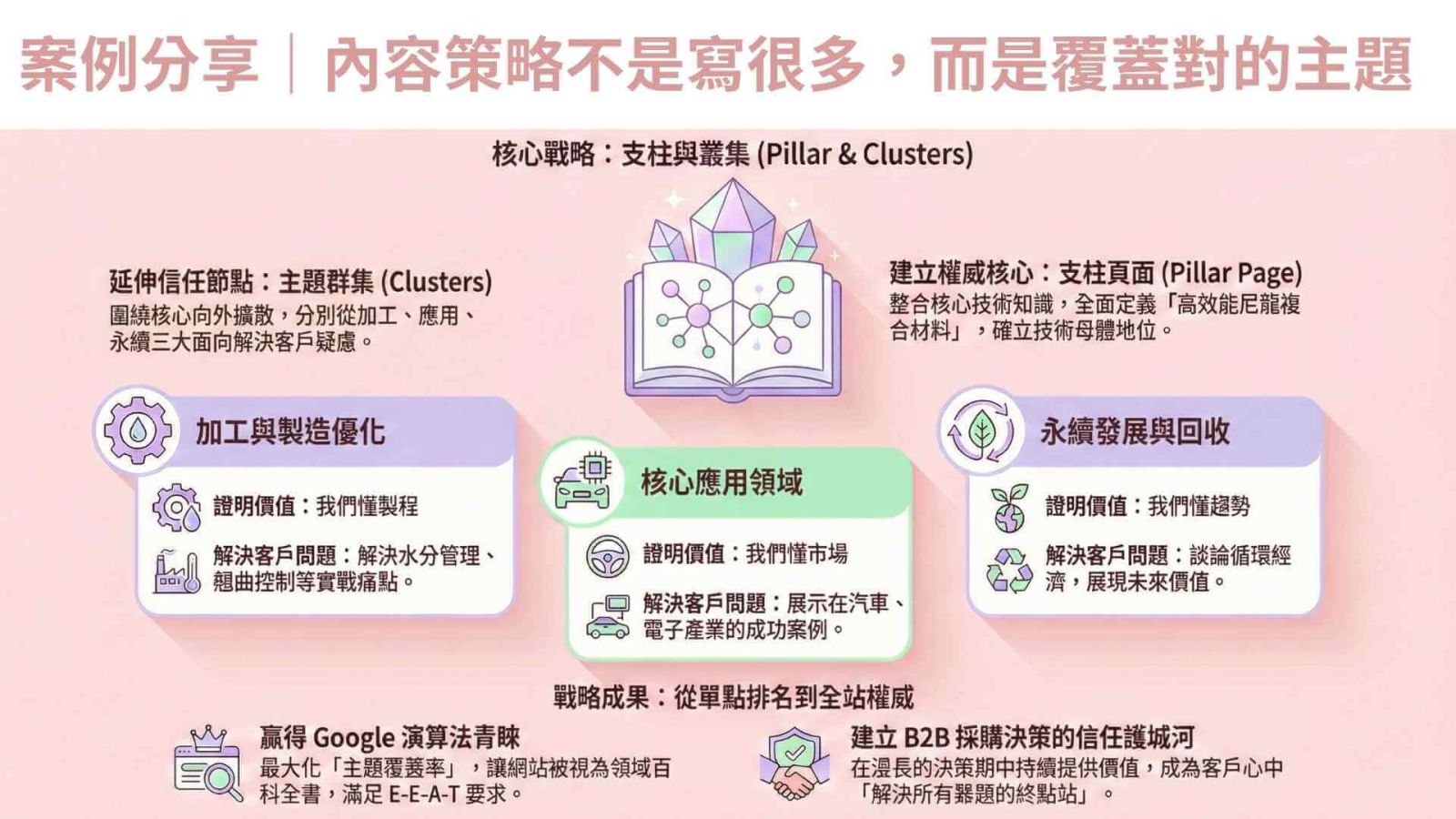 面對這種地段擠壓,我們必須啟動「雙核心佈局」,既要守住傳統攤位,也要攻下 AI 服務台。接下來,我要分享一套經過實戰驗證的「B2B 優質內容黃金公式」,這套三大心法將讓您成為 AI 搜尋中不可撼動的「唯一標準答案」: