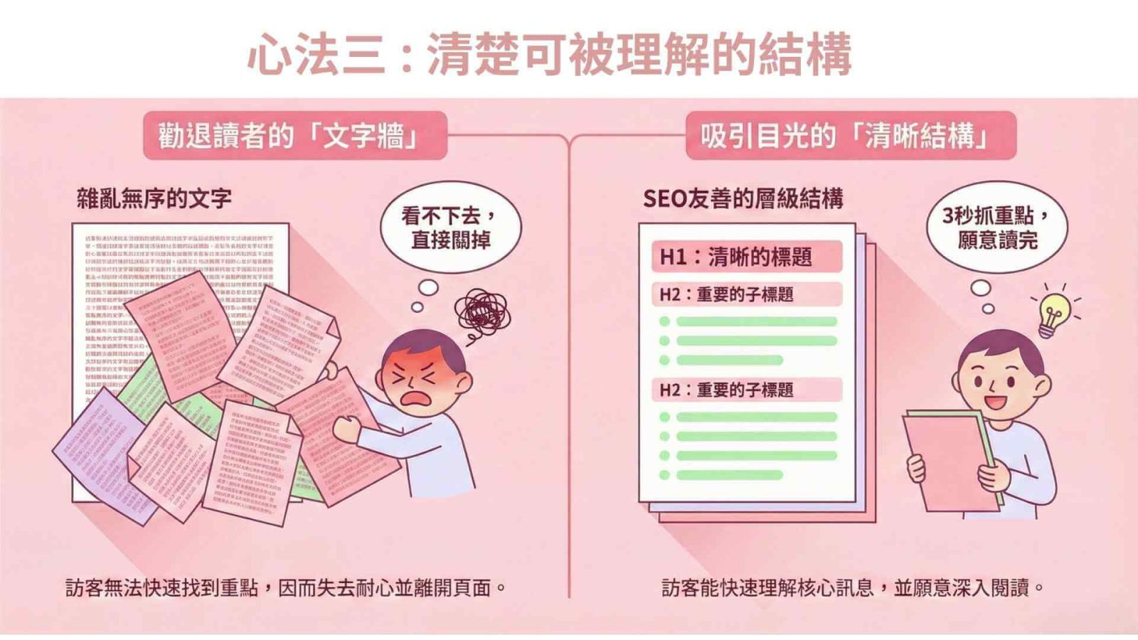 B2B 採購經理非常忙碌,看到密密麻麻的文字通常會直接跳出,這也是我們 SEO 顧問陪跑團早在多年前就持續推廣的核心觀念:文章必須「結構化」,更要具備極高的「易讀性」。