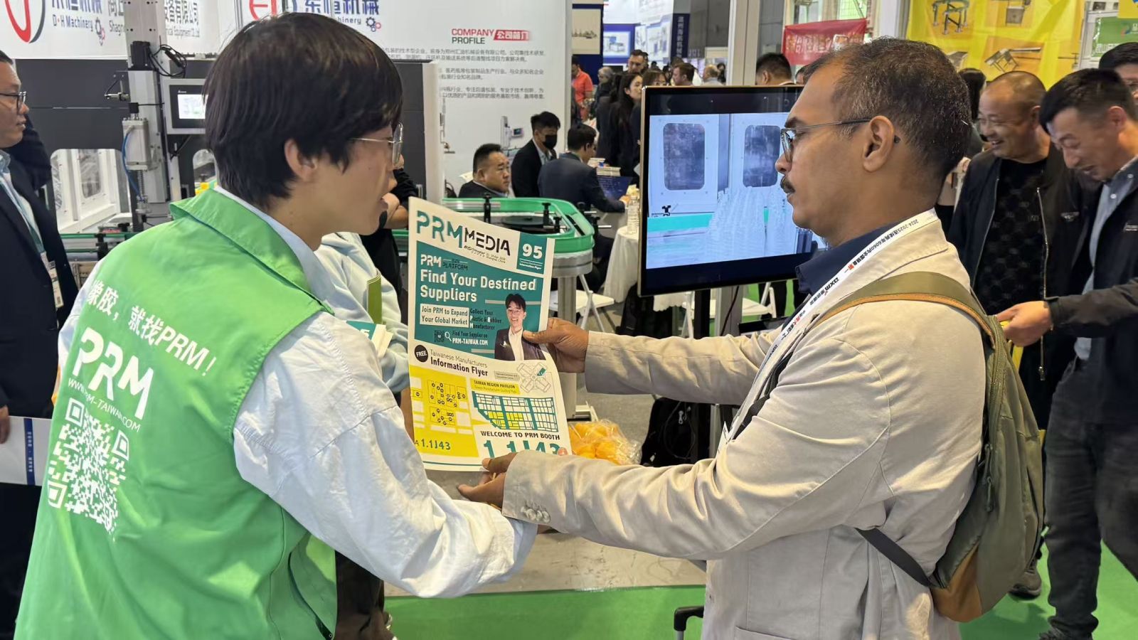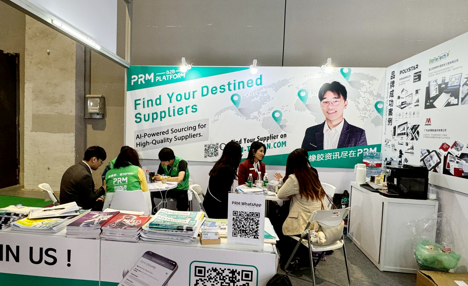 雖然台灣的參展廠商數量不如以往,但有幾家是隔了多年又重回 CHINAPLAS,像是百久、三夏。同時,PRM 也聘請當地展務人員協助派發展報、填詢問函。這次比較特別的是:我們開始使用 PRM 剛完成的 AI 填問卷系統,只要把名片拍照,系統就能自動帶入買主資訊,大幅降低人工 key in 的錯誤率,也讓整體處理速度快很多。