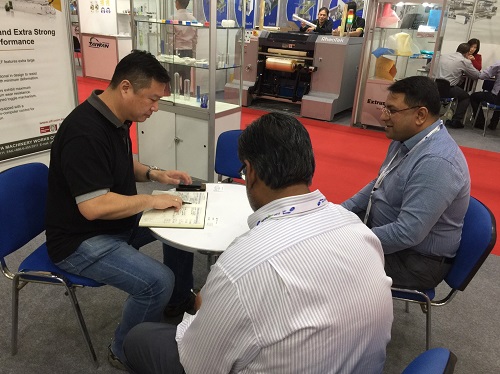【峰明】已是連續第 12 次參加杜拜展,可說是台灣廠商中的老前輩,深耕市場多年,在整個中東地區約有 7 成的市佔率,機器品質穩定、效率高、售後服務好,為許多買主指名的台灣製袋機廠商。這次杜拜展攤位上熙來攘往、應接不暇。首先受訪的廖文千區域經理指出,杜拜是整個阿拉伯地區的金融中心,磁吸鄰近的沙烏地阿拉伯、科威特、約旦,到埃及、利比亞、阿爾及利亞、突尼西亞,甚至亞洲區印度的客人,目前阿拉伯市場中背心袋、垃圾袋、冷凍雞袋等的需求都很高。